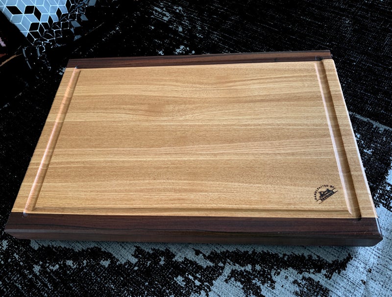 Prachtige luxe snijplank gemaakt van noten en eikenhout. Deze combinatie levert in kops hout verbinding dit uniek patroon op.