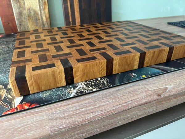 Mooie kopshouten snijplank met een luxe uitstraling en bijzonder blok/streep motief gemaakt van een combinatie van eiken en notenhout. Echt een sieraad voor in uw keuken of om cadeau te doen natuurlijk.